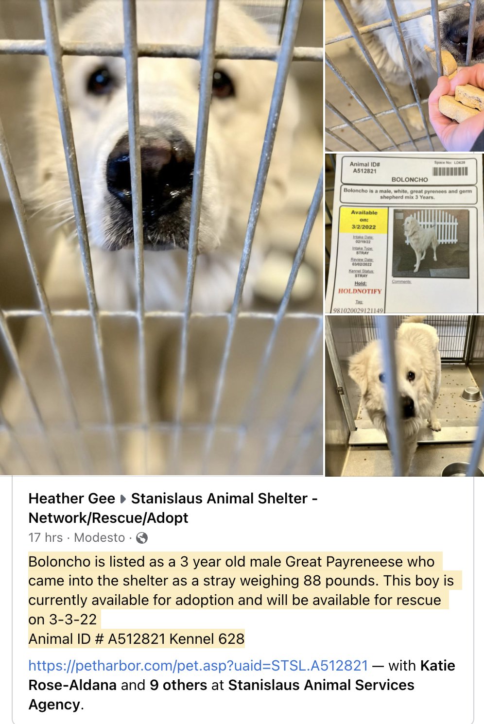 Furry Friends Rescue On Twitter Adopt Boloncho At Stanislaus Animal Shelter 3 Yrs Male Greatpayreneese 88 Lbs Who Came Into The Shelter As A Stray Weighing 88 Pounds Animal Id A512821